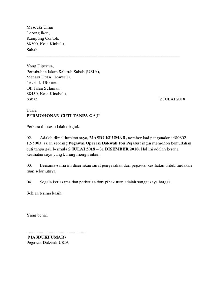 Contoh Surat Permohonan Cuti Tanpa Gaji Urusan Peribadi.